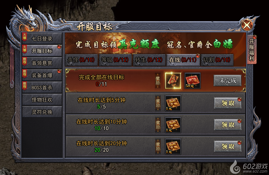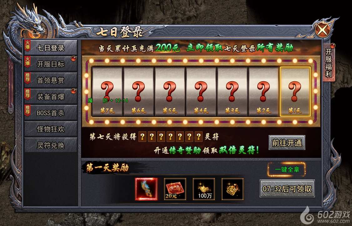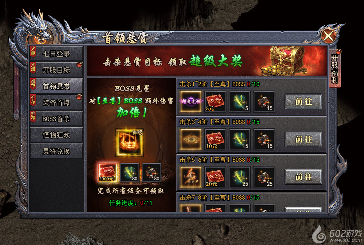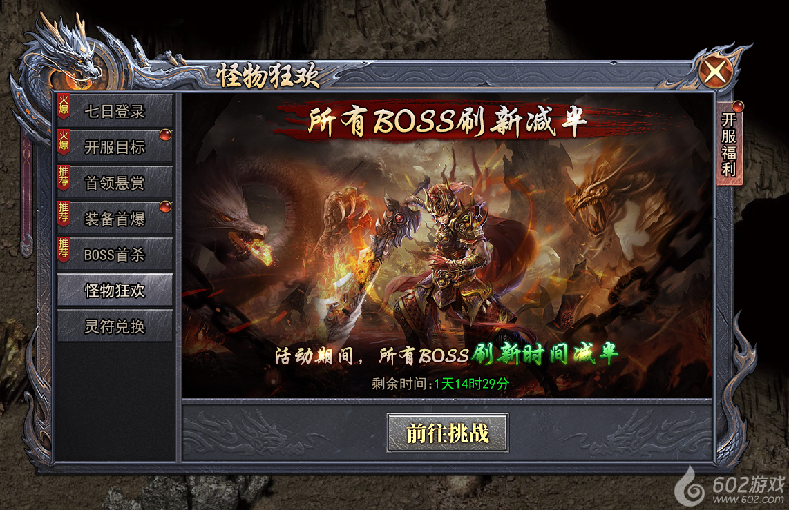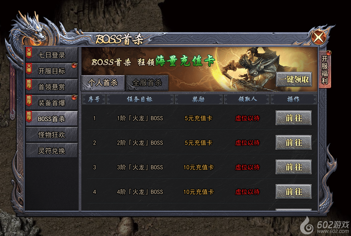 活动说明:活动期间BOSS首杀狂领海量充值卡。