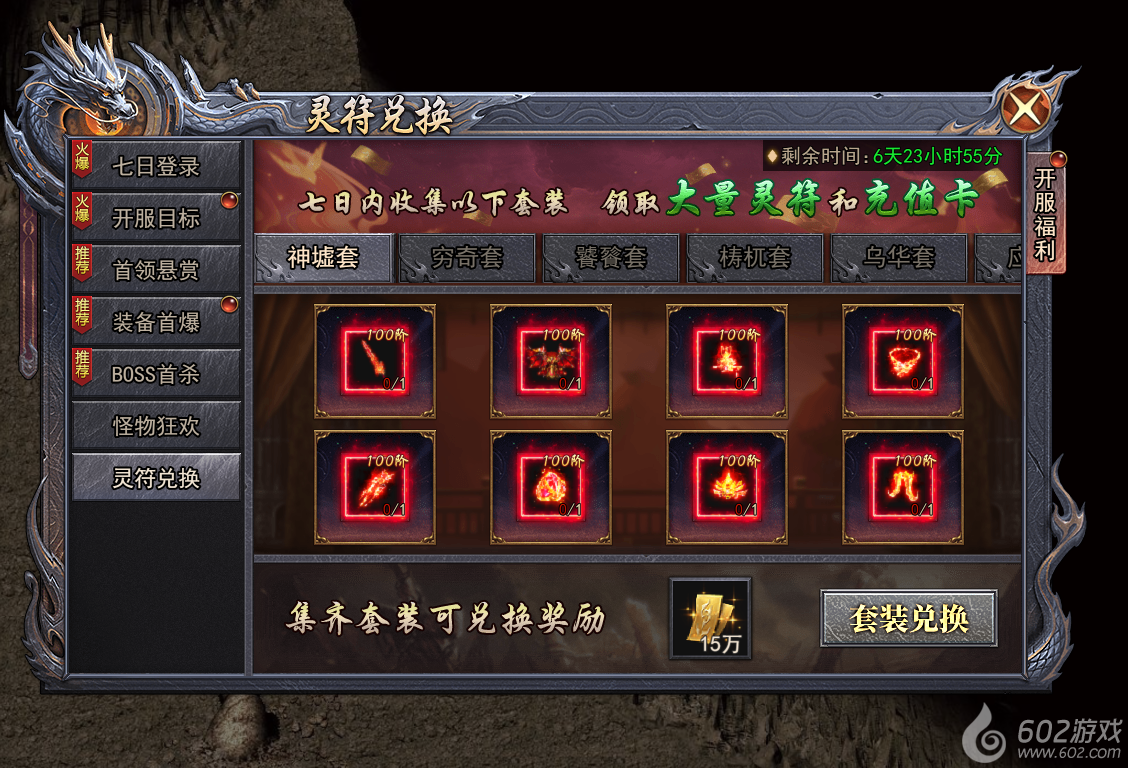 活动说明:活动期间,七日内收集以下套装领取大量灵符和充值卡。