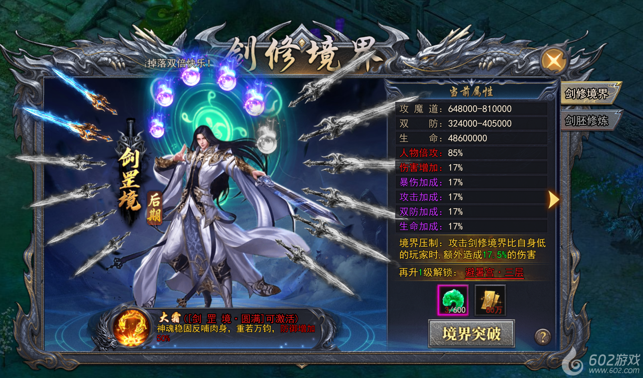 3.剑修境界达到指定等级后,可解锁【剑气长城】地图,爆【剑神沉默】专属装备